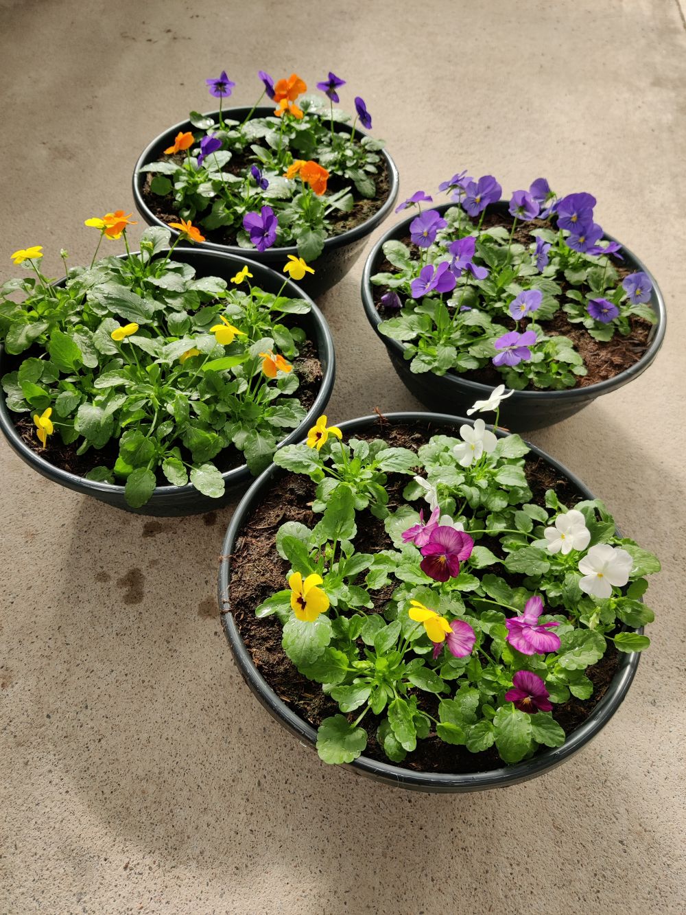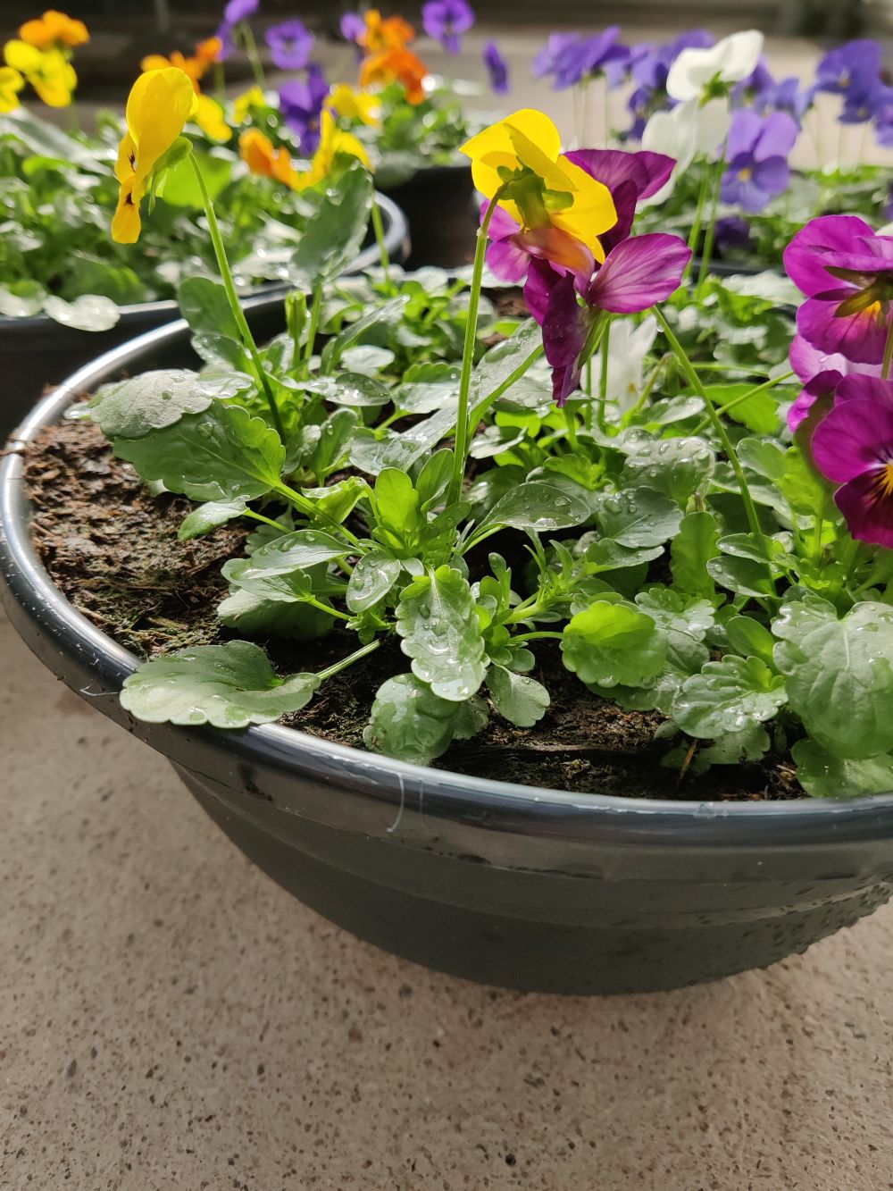 Orvokit on istutettu kauniiseen, tummanharmaaseen muoviastiaan.